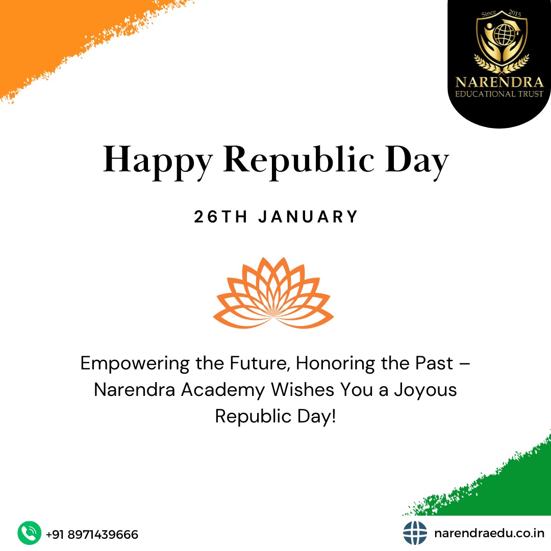 Empowering the Future, Honoring the Past – Narendra Academy Wishes You a Joyous Republic Day! Narendra Academy, dedicated to education and enlightenment, extends heartfelt wishes on Republic Day. As India celebrates the historic adoption of its Constitution on January 26, 1950, transitioning into a sovereign republic, we honor the core values of democracy, liberty, and unity that define our diverse nation. Specializing in educational excellence, Narendra Academy joins in the promise to enrich and preserve India's glorious heritage. On this special anniversary, let's collectively pledge to contribute to the ongoing betterment of our motherland. Wishing you a very Happy Republic Day 2024.