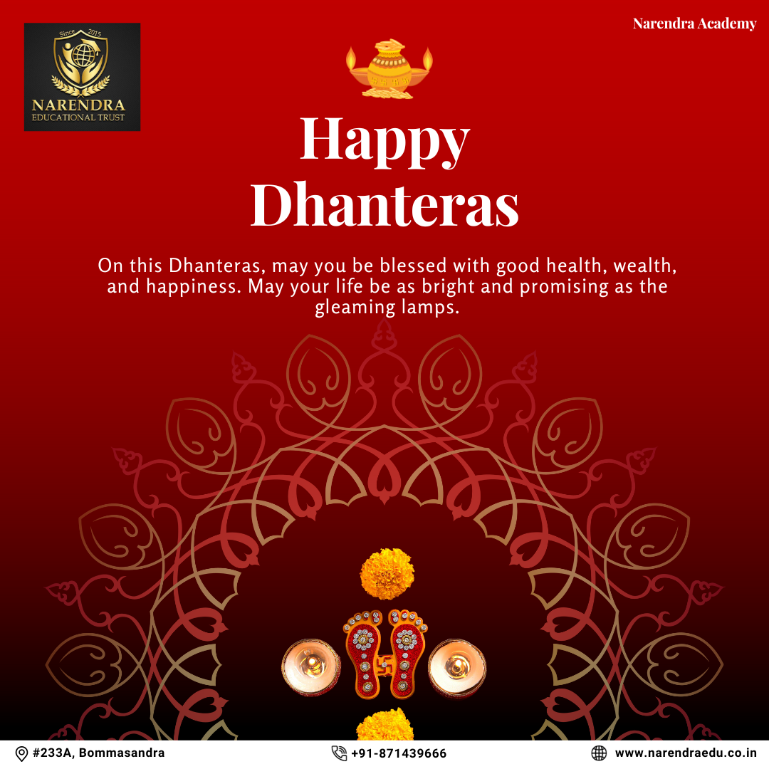 "May the festival of Dhanteras usher in a year filled with brilliance and prosperity for all the students at Narendra Academy. Wishing you joy, success, and the glow of accomplishment on this auspicious occasion. Happy Dhanteras!"