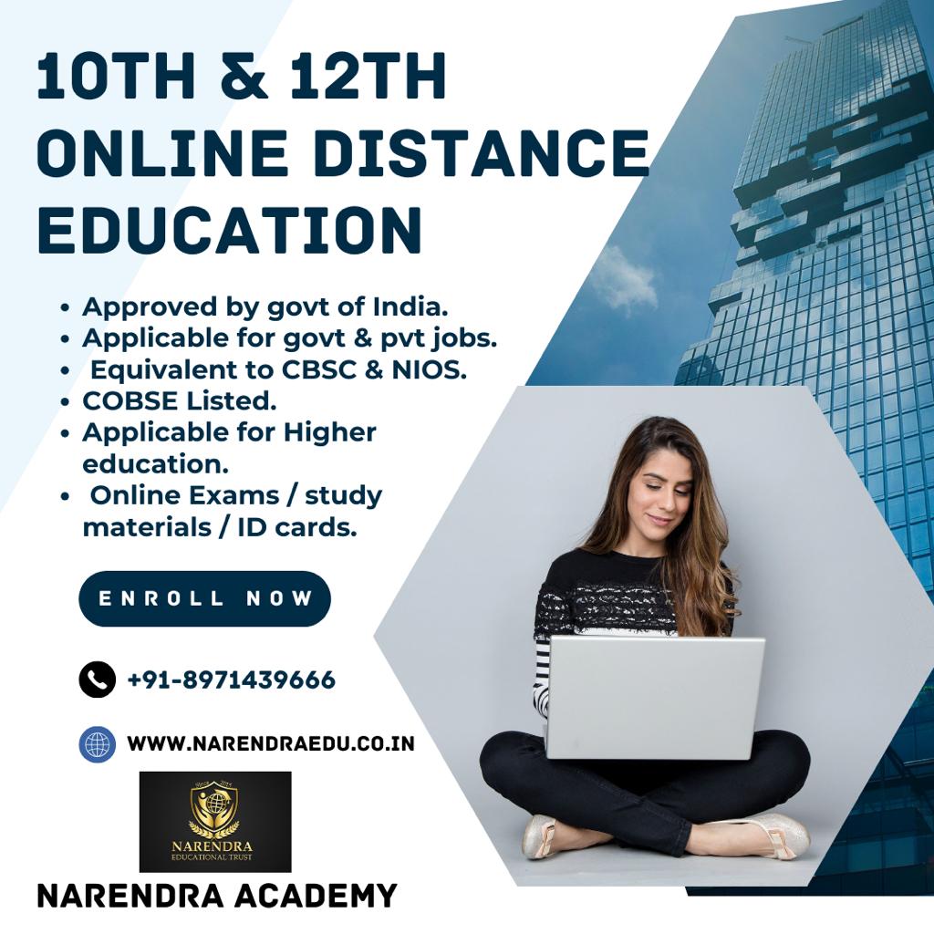 Narendra Academy's Online Distance Education: Your Path to Success Looking for a convenient way to complete your 10th and 12th grades? Narendra Academy offers an approved online distance education program with numerous benefits: - Government Approval: Our program is recognized and approved by the Government of India, ensuring its validity. - Job Opportunities: Our certificates are accepted for both government and private jobs, making you eligible for a wide range of career options. - High Standards: Our curriculum matches the quality of CBSE and NIOS, maintaining high academic standards. - COBSE Listed: We're listed by the Council of Boards of School Education, which adds to our program's credibility. - Higher Education: Your Narendra Academy certificate is a stepping stone to pursue higher education. - Online Convenience: We offer online exams and study materials for a flexible learning experience. - Official ID Cards: As a student, you'll receive official identification cards. Join Narendra Academy's Online Distance Education program for a flexible, high-quality education that opens doors to various opportunities. Your future is just a click away. Enroll today!